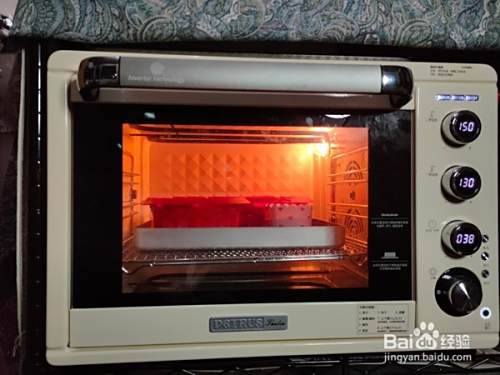 烤箱上火150度下火130度提前十分钟预热,然后放入模具,烘烤38分钟左右。