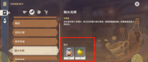 在原神游戏中最近开启曲生酌微梦的调制饮品的活动,其中酸沁光辉是红茶类的饮品,这个饮品的口感是偏酸的,不过酸爽更能激发人的活力,有玩家还不知道配方是什么,接下来小编为大家带来了详细介绍,希望可以帮助到大家。