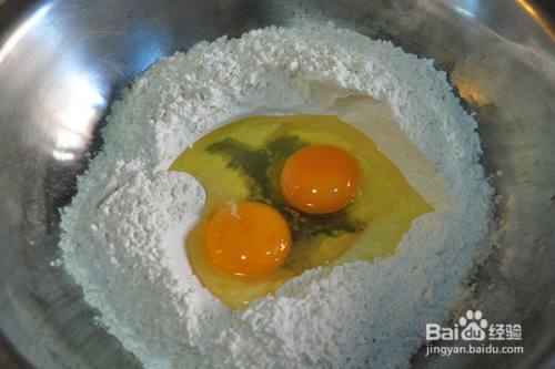 准备足量的面粉(高筋面粉),中间挖出一个小坑,打入鸡蛋后用手搓成雪花状,然后就开始揉面。