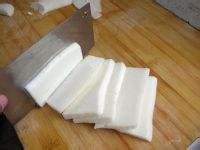 利用这个时间把山药去皮、切成与五花肉大小相同的山药片。