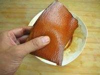 五花肉皮煎好后,肉皮朝下用卤汁或肉汤等泡至炸制过的表皮起皱。