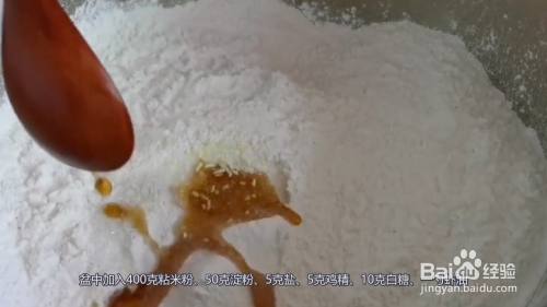 盆中加入400克粘米粉、50克淀粉、5克盐、5克鸡精、10克白糖、一勺虾油,倒入400克清水,搅成絮状,加入配菜,抓拌均匀。
