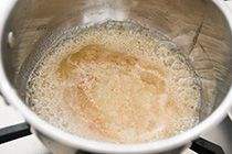 3一直加热到锅中混合物呈现焦糖(琥珀)色后再小火加热5分钟关火, 加入香草精、黄油混合均匀~等到黄油完全溶化后,筛入泡打粉混合均匀~ 会发现混合物有一点点上涨~ 是因为泡打粉的原因~不用担心~~:)