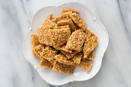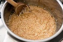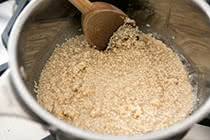 厚底锅(薄底的有毁锅的危险!!:O)中加入蜂蜜,糖,肉豆蔻,水,盐混合加热,中火哟~~ 一直加热到呈现图片中的颜色后加入芝麻~~