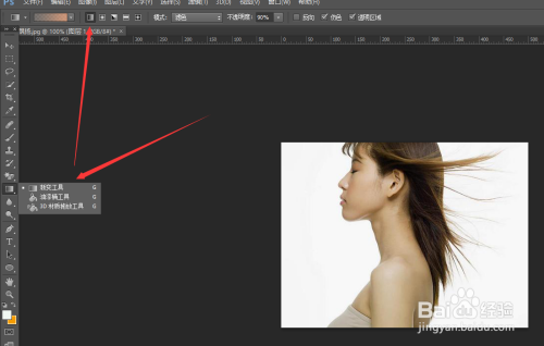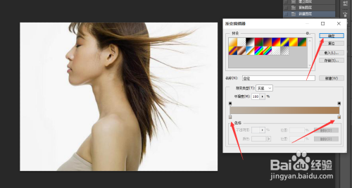 点击工具栏“渐变工具”,在菜单属性栏中选择线性渐变,点击左上角渐变图标将渐变编辑器调出来,选择合适的渐变颜色,然后从左到右拉一条渐变