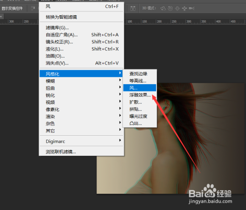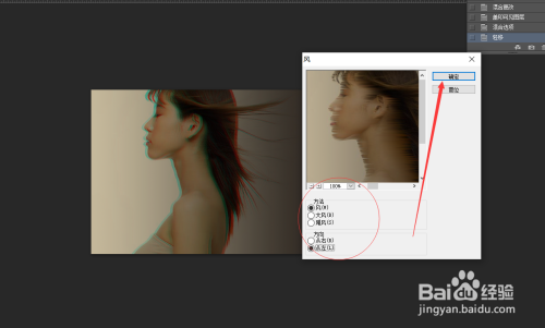 点击菜单栏”滤镜“”风格化“”风“,可以对风的效果进行设置,设置完成后点击确定,最终效果图即出现