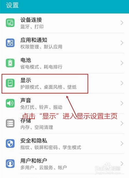在设置主页,选择“显示”,进入新页面,即显示设置主页。