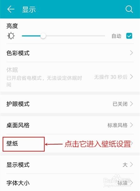 在进入显示设置主页,选择“壁纸”进入壁纸设置。