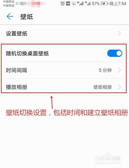 壁纸选择完成,再返回上页,设置壁纸定时随机切换,建立壁纸专用相册,设置切换时间间隔,一般随自己兴趣,例如设为5分钟左右。