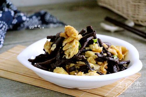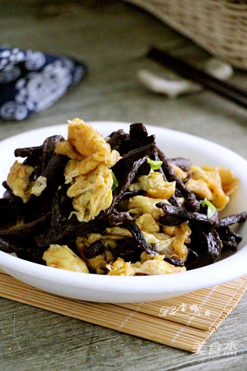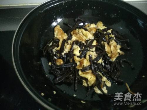7疙瘩丝油润倒入鸡蛋翻炒均匀,再次加入葱丝提味即可关火出锅