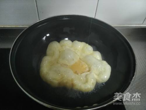 4锅内加入植物油,大火烧热,油冒烟的时候倒入鸡蛋液,鸡蛋会立刻膨很大,一面金黄用筷子夹起摊另一面,用筷子夹成小块,夹出备用 (高油温摊鸡蛋才能长大个)