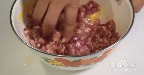 加上点温水,要用上劲,打到肉馅粘连在一起。