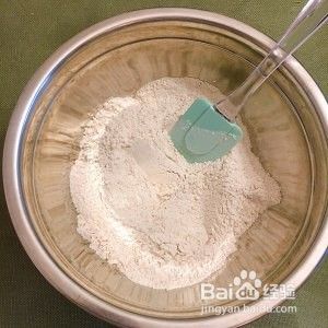 把【鸡蛋】打进面粉混合物里,用小铲子拌匀。