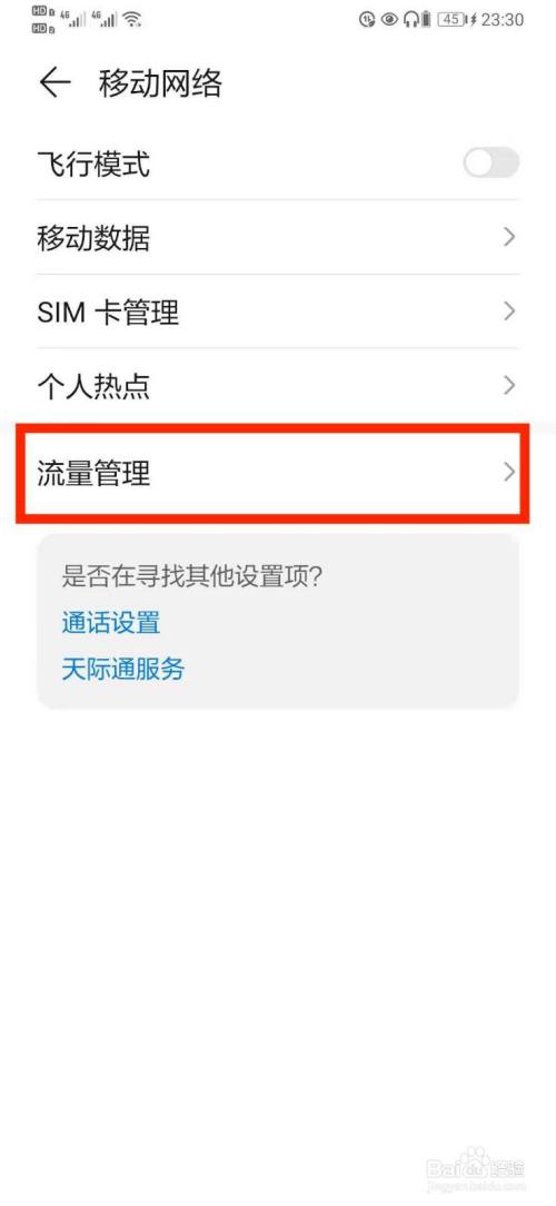 在移动网络页面,打开【流量管理】选项,如下图所示。
