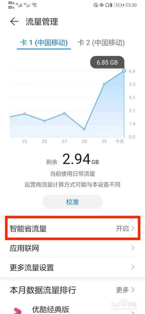 在流量管理页面,打开【智能省流量】设置项,如下图所示。