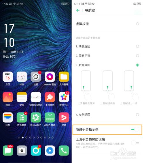 2、如果不想相应的导航条显示出来,可以通过【设置】--【便捷辅助】--【导航键】--打开【虚拟按键可隐藏】开关,手机底部左侧会出现下箭头指示,点击即可隐藏。