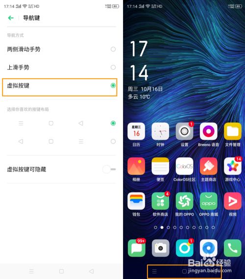 1、通过桌面的【设置】--【便捷辅助】--【导航键】进入,选择【虚拟按键】导航,可以看到有2种不同的按键布局,你可以按照自己的习惯来进行选择使用。