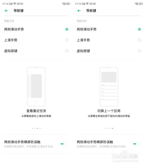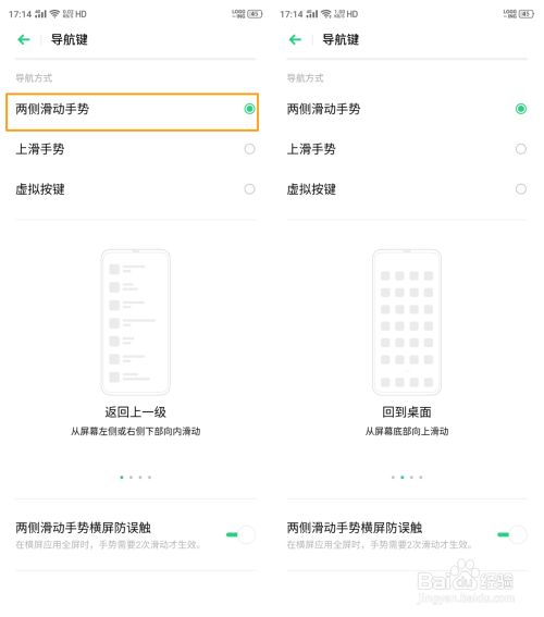 1、通过桌面的【设置】--【便捷辅助】--【导航键】进入,选择【两侧滑动手势】导航,可以看到4种【两侧滑动手势】的具体使用方法。