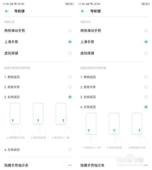 2、选择【上滑手势】导航,可以看到有4种不同的手势布局,你可以按照自己的习惯来进行选择使用。
