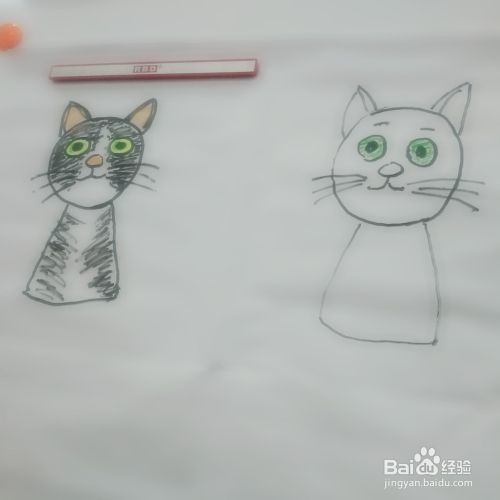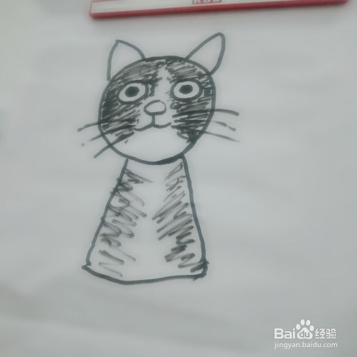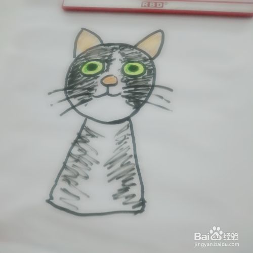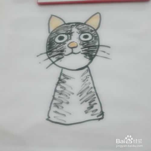 再来装饰一下,用黑笔在猫的脸上画它的细毛,就是用黑色水彩笔轻轻的涂黑就是。猫稍装饰后就来涂色,只要涂它的眼睛鼻子就好几。第一种画法完成。