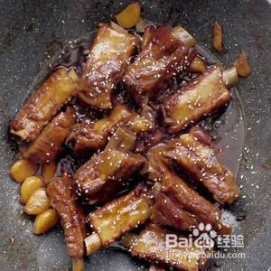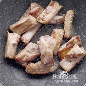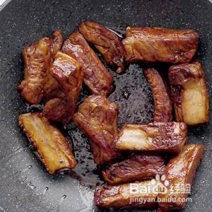放入排骨、姜片,转大火炒干水分,至排骨微焦。