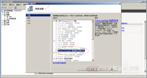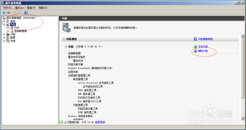 唤出"服务器管理器"程序窗口,选择左侧"服务器管理器→功能"文件夹。