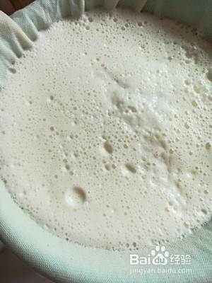搅拌好的豆浆倒到双层折叠的沙布上挤压,过出豆浆
