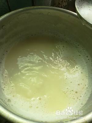 过滤好的豆浆放进锅里煮开,边煮边用勺子把泡沫倒掉。煮开后再继续用小火边搅拌边煮5分钟,关火放凉3分钟后,把豆浆从高处(大概60厘米高)快速倒下装有内脂的电饭锅内胆,搅拌几下