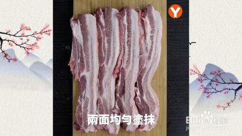 在五花肉上撒上腌料的盐,抹均匀;再翻面静置15~20分钟至表面渗出水分。