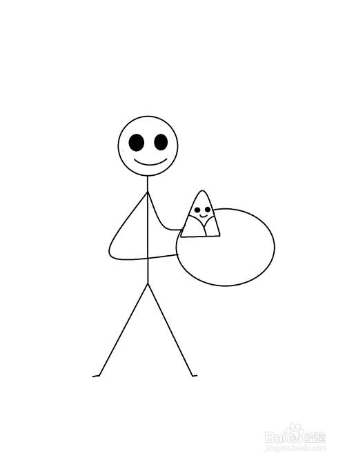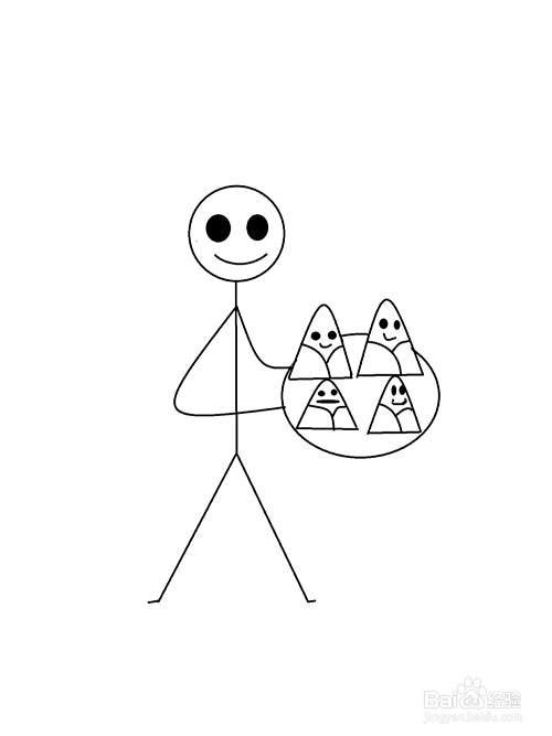 接下来在手里画出一个椭圆形的盘子。在盘子上画一个粽子。