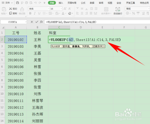 然后在单元格当中输入VLOOKUP函数公式,如下图所示,3代表科室存在于表2的第三列,FALSE代表精确匹配