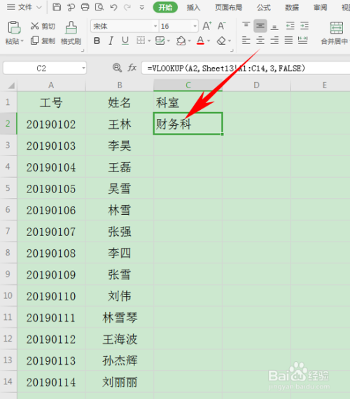 单击回车,我们看到科室就显示为财务科了,如下图所示