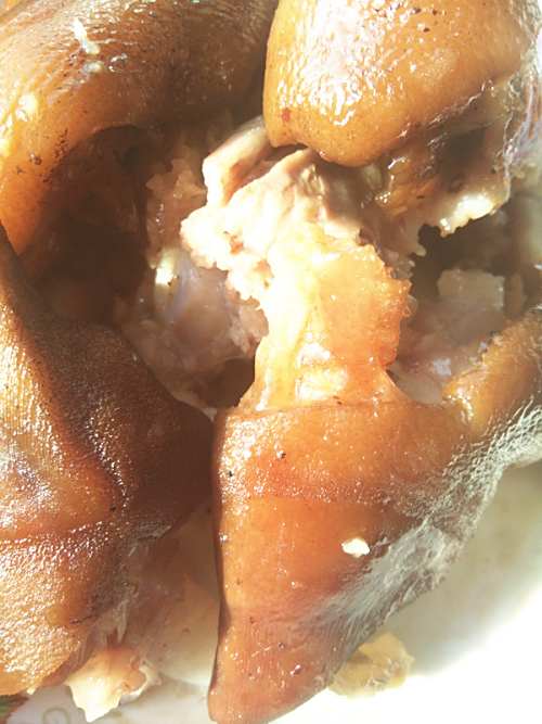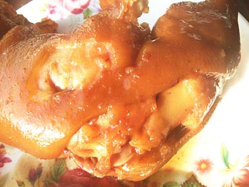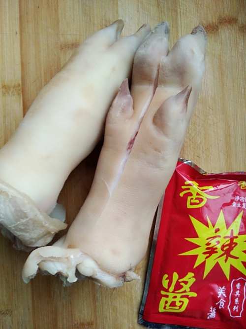 1猪蹄洗干净,用开水烫2分钟,在蹄心划一刀,我喜欢香其酱,它的颜色也是赏心悦目,朋友们可以根据自己的喜欢添加辣酱。