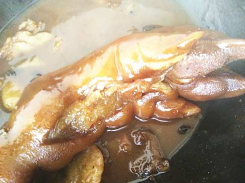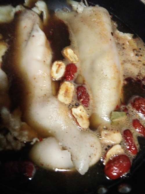 4猪皮容易沾锅底,要勤翻动,大火烧开尝尝咸淡,淡了加盐,收汤,用筷子戳戳猪蹄筋,不要煮的太烂,没有劲道,吃着没感觉