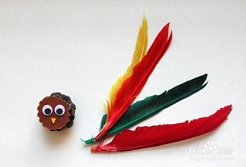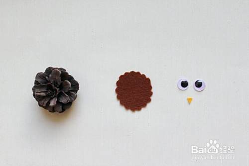 4、将圆形花边不织布用双面胶粘在松塔上,再粘上眼睛和嘴巴。准备彩色羽毛备用。