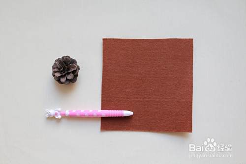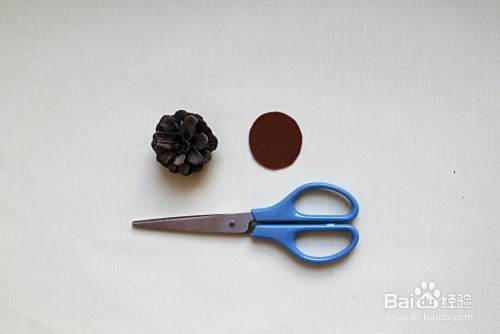 1、准备松塔和棕色不织布。用笔在不织布上画出与松塔等大的圆形。