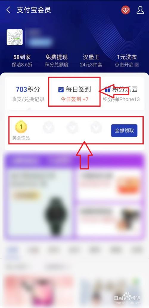 在支付宝会员页面中,点击下方的"每日签到"、"全部领取"选项,收取支付宝积分。