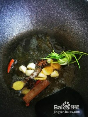 继续小火放入葱姜蒜,八角,桂皮,干辣椒,煸香。