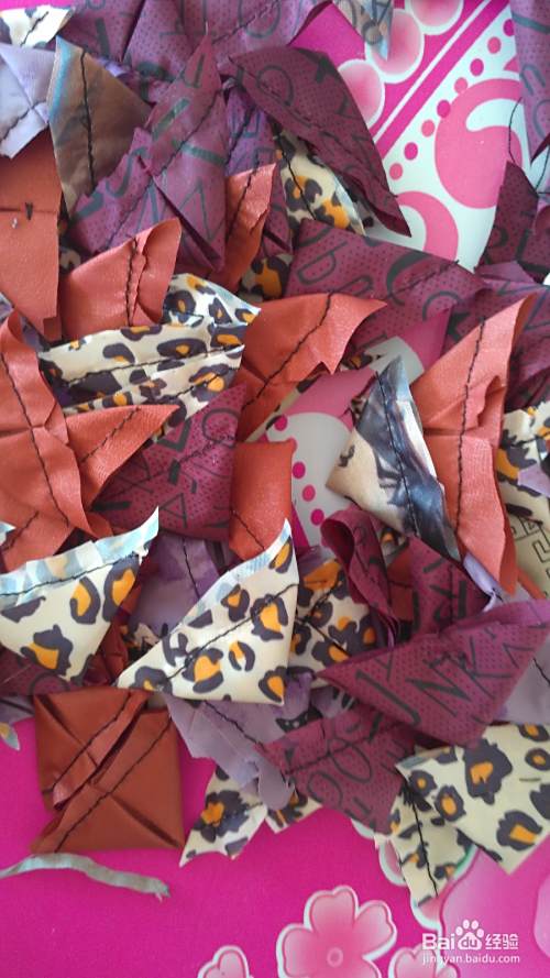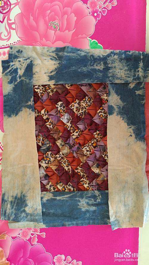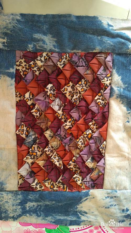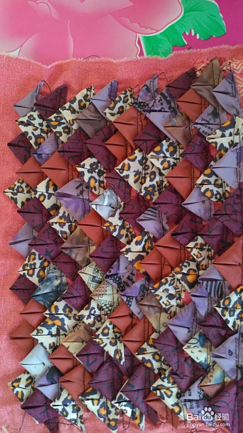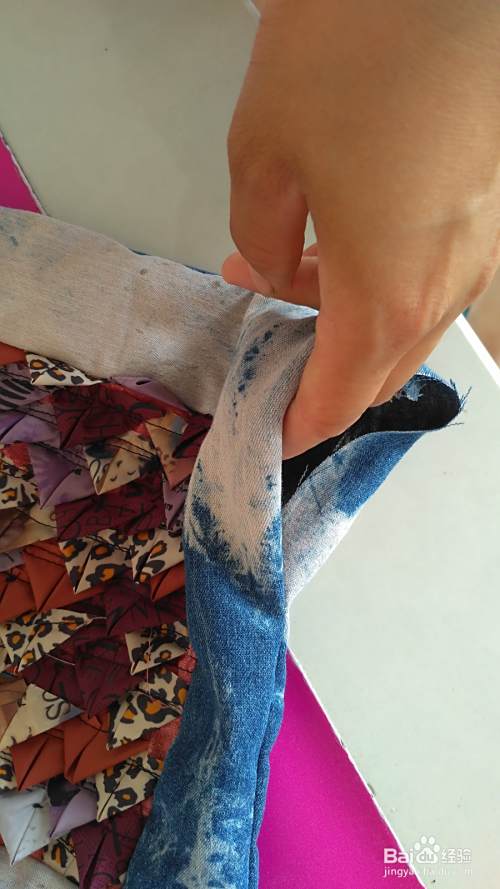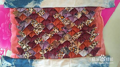 选择一块颜色相近且结实的布块(如图),用缝纫机按重叠交叉的顺序,一层层缝好固定(如图)。按顺序一层层缝好固定,每层三角形的摆放距离一致,尽量用下一层三角盖住线头(如图)。