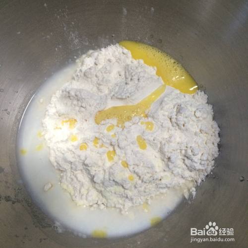 将面包粉、糖、盐、酵母、水、鸡蛋液一起搅拌均匀揉成团。