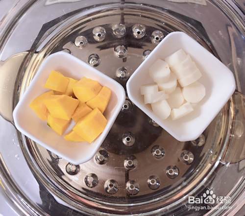 山药、南瓜放进蒸锅蒸熟,约15-20分钟,蒸的时间根据块的大小来决定,最终要蒸到用筷子轻松挑开就可以啦