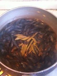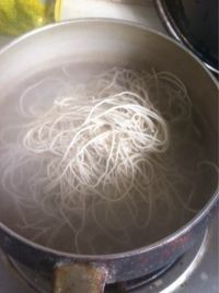 另一锅里水煮开后加入面条, 煮开后加冷水,再次煮开就捞出