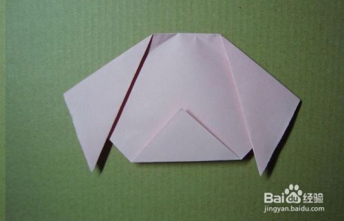 然后把小三角形的上边向下折出一个小三角,这是折出小狗的小嘴巴,如下图所示。