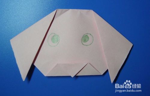 折纸小狗,折好后,用彩铅笔给其画上两只大大的眼睛,这样一只可爱的小狗就做好了,如下图所示。