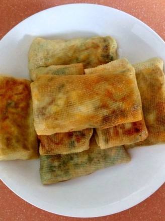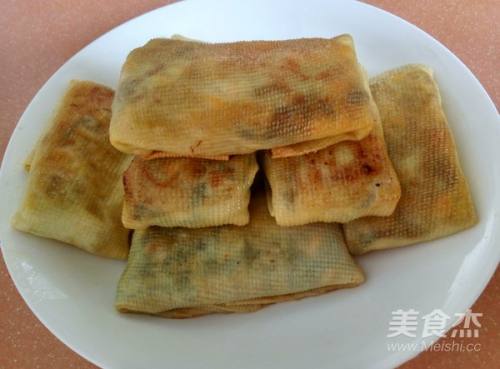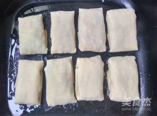 8热锅倒油,放入豆皮卷小火慢煎,收口处朝下