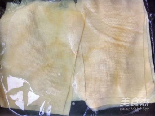 3将豆皮切成想要的长方形大小;锅中烧开水,将豆皮放进去焯一下捞起