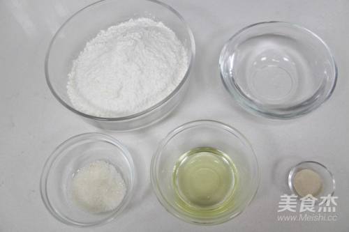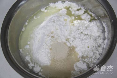 4将面粉过筛,加入细砂糖,盐,酵母、色拉油和清水拌匀