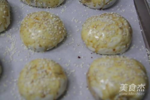 14最后,在饼上用毛刷刷上糖液,撒上白芝麻