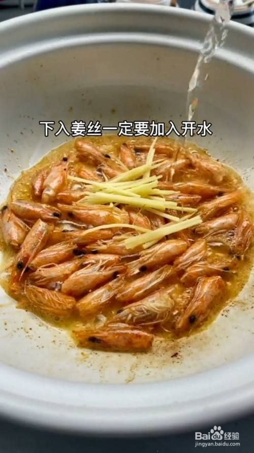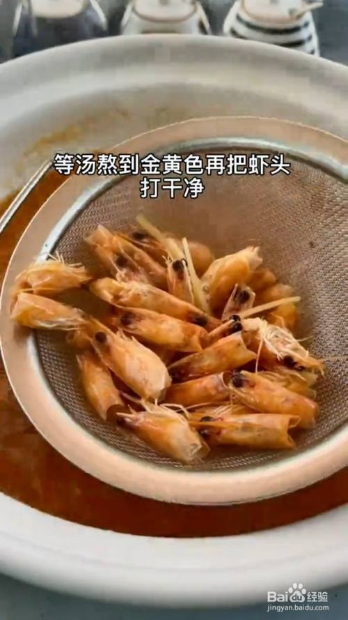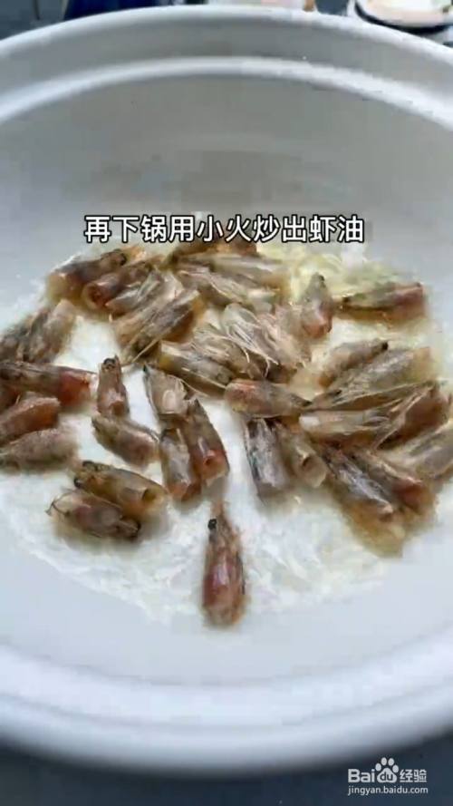 油热下虾头炒出虾油,放姜丝,加开水,煮开捞出虾头