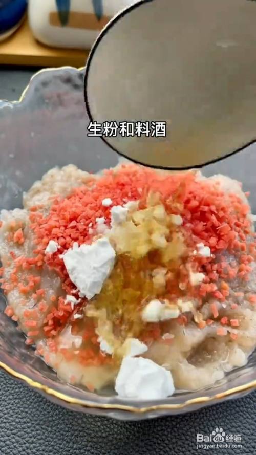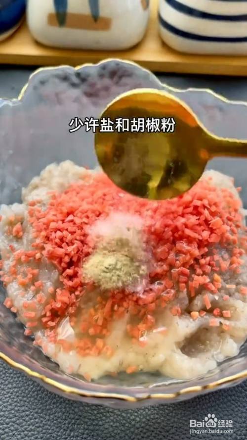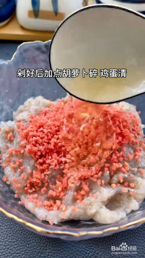 加胡萝卜,蛋清,加盐胡椒粉,生粉料酒,搅匀